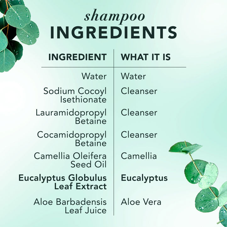 The Eucalyptus Shampoo sweeps away oil and buildup with a rich, foamy lather, leaving your scalp feeling fresh and balanced. Infused with eucalyptus, aloe, and camellia, itâs made with certified pure plants and botanicals certified by the Royal Botanic Gardens, Kew, so you know youâre giving your scalp the care it deserves.